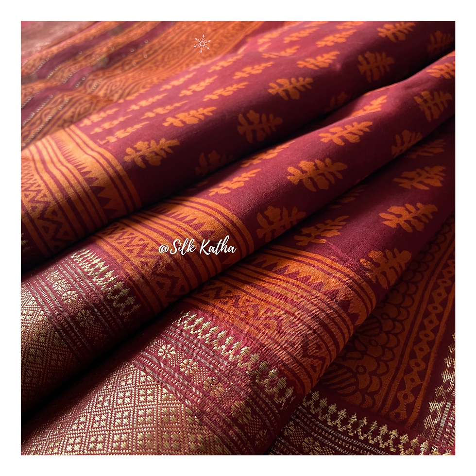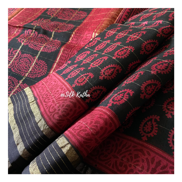 Bagh printing, previously known as alizarin printing, is manual and laborious, involving several processes of repeated washing, dyeing, and printing. Bagh prints have adorned not just cotton and silk fabric, but cotton-silk, tussar, jute, and crepe as well and transformed into attractive stoles, dupattas, elaborate saris etc.